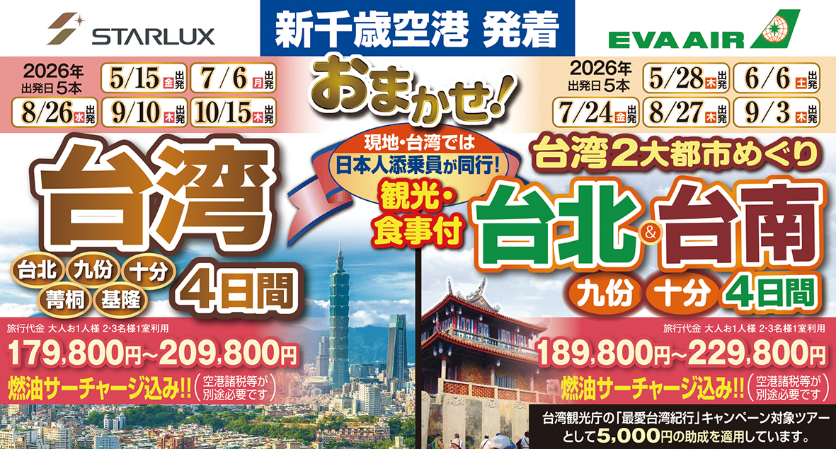 大人気の添乗員同行ツアー。ターラックス利用で快適な空の旅と、台北宿泊の4日間。人気の定番スポットから新名所までをご案内!グルメ満載の4日間!