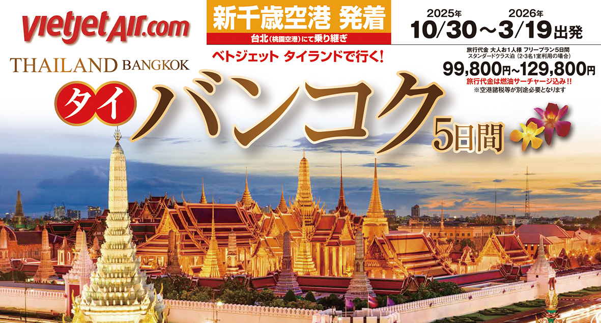 バンコク5日間10月~3月★7/16より運行再開!ベトジェット タイランド!空港-ホテルの往復送迎付フリープラン!人気のオプショナルツアーで是非お楽しみください!