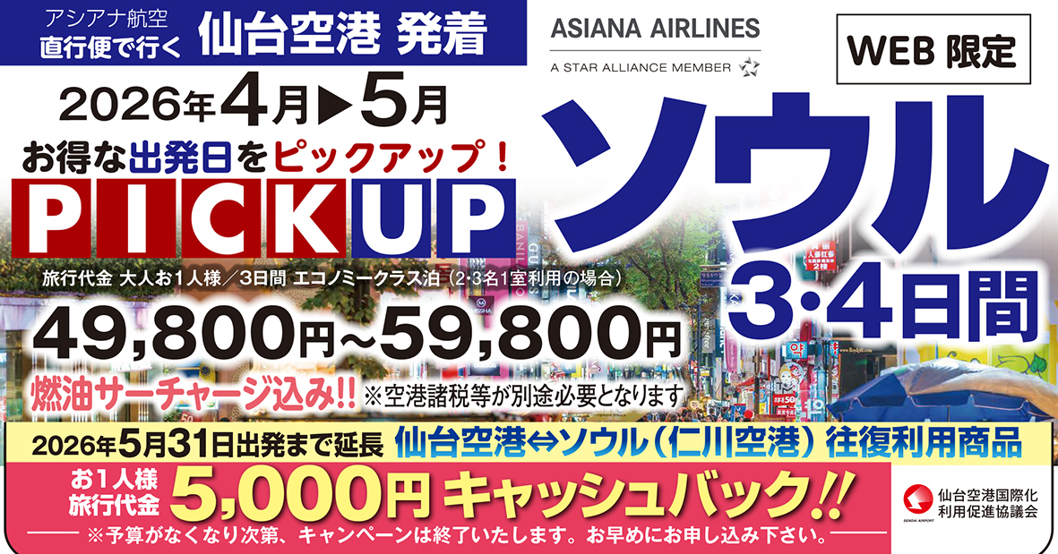 - \5月まで延長!お得にソウルへ☆旅行代金キャッシュバック!/